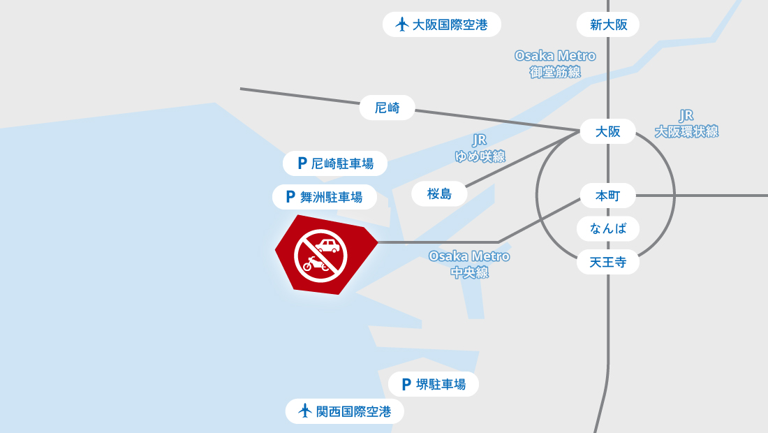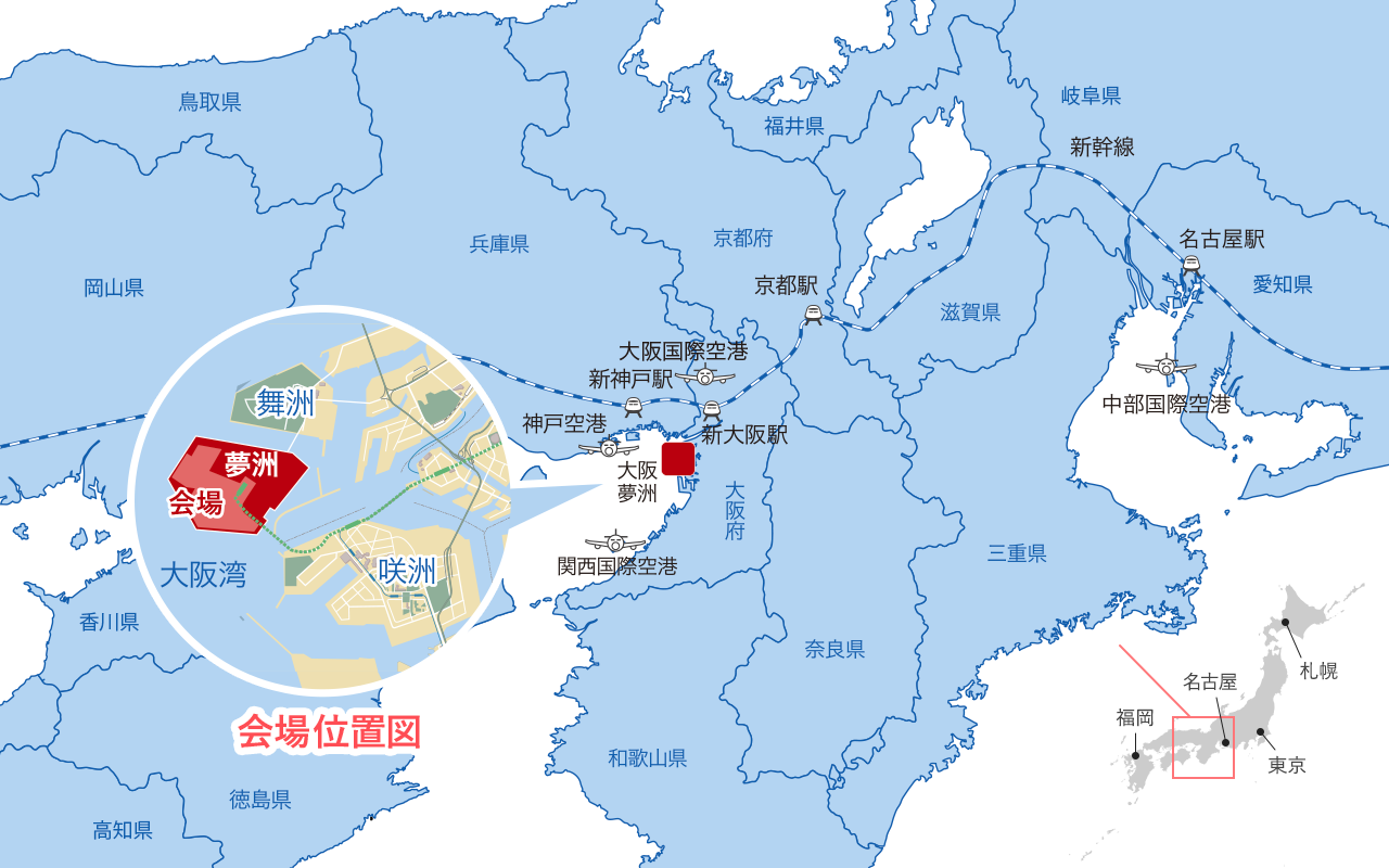 大阪萬博的舉辦地點是位於大阪市此花區的人造島「夢洲」。由於會場周邊僅設有無障礙停車位,建議使用大眾交通工具前往。