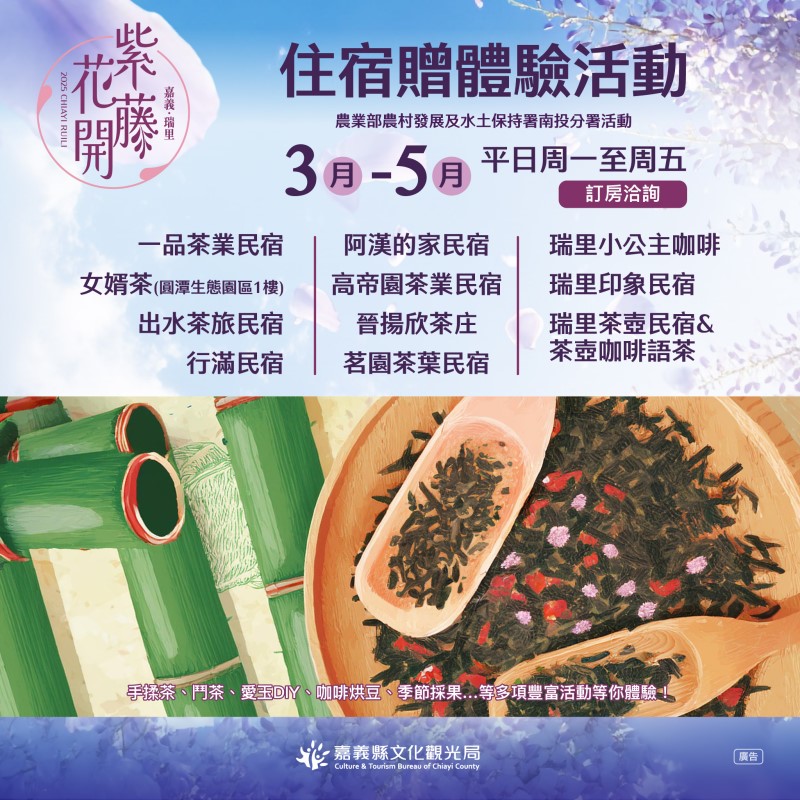 只要加入「慢遊嘉義」LINE官方帳號,即可享有超過20間在地店家的優惠券,活動到6月底,農業部農村發展及水土保持署南投分署也與11家業者推出平日住宿送體驗活動,活動到5月底,就算錯過紫藤花季,也可以到嘉義縣梅山鄉瑞里一帶旅遊踏青,享受悠閒的山林時光。