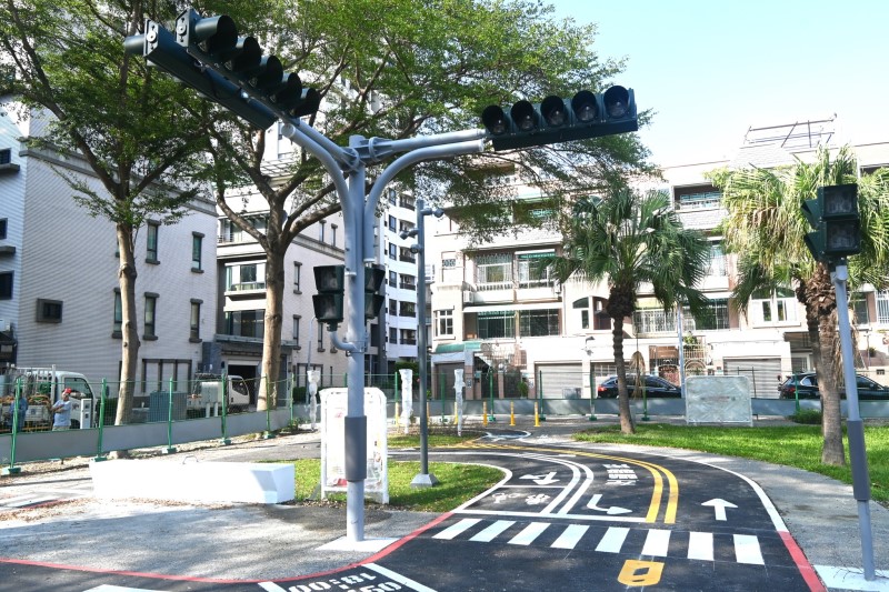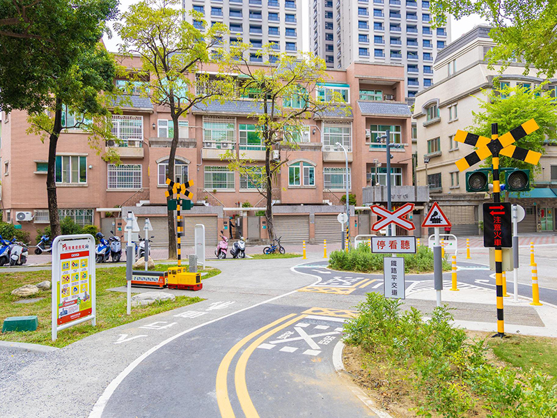 這裡不僅是一座公園,更是一座寓教於樂的學習空間。園區內設有車道、人行道、行人專用號誌、行人穿越道線等設施,甚至參考圓環設計,以高度擬真的方式重現都市交通環境,讓學童與家長透過模擬體驗學習「行人優先」、「路口慢看停」等重要交通安全觀念。透過這樣的親子共學方式,不僅能讓孩子從小建立安全意識,也能幫助家長以身作則,帶動整體交通素養的提升。