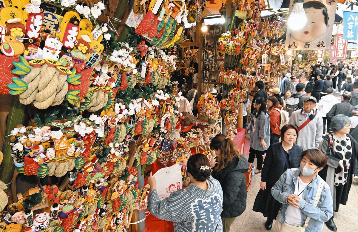 說到酉之市的特色,那莫過於是象徵這場活動的裝飾吉祥物「熊手」了,熊手原本是清掃樹葉的竹製掃帚,熊手取其將落葉聚集起來的意象,象徵著把好運也聚集起來,在每年的酉之市上,總能看到各種花樣的熊手,不論是掛在牆上擺是或是隨身攜帶都很不錯,感興趣的你務必造訪看看!