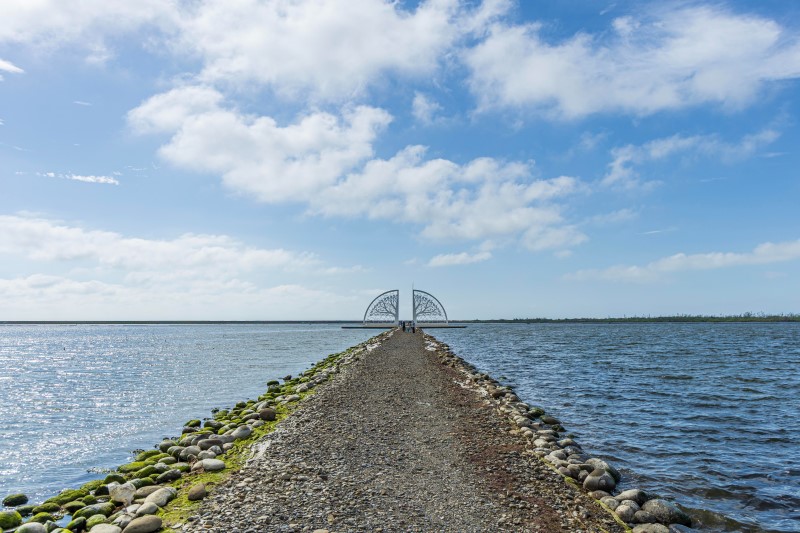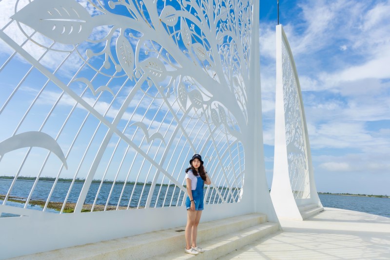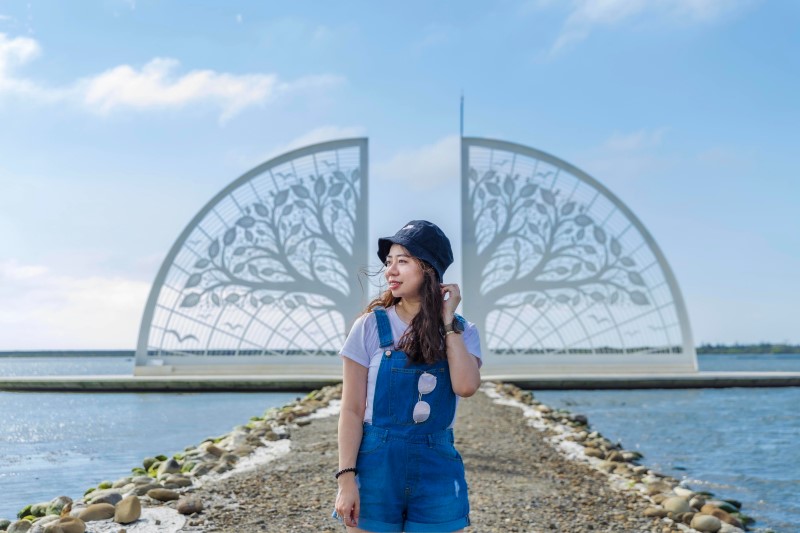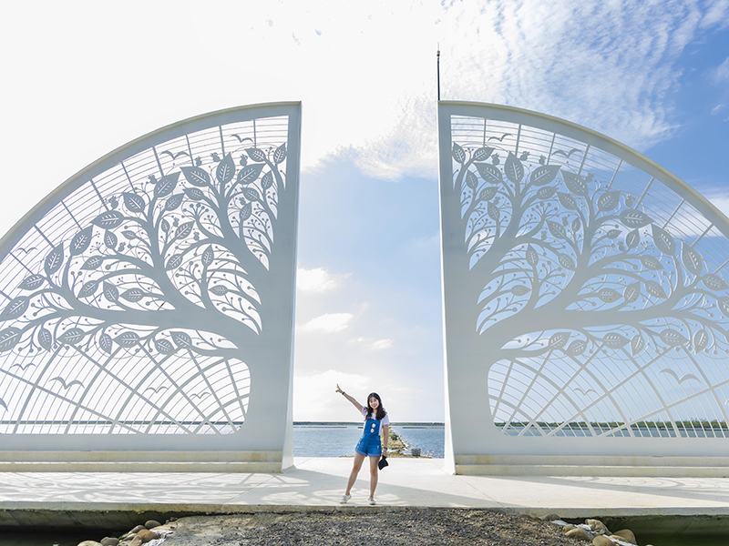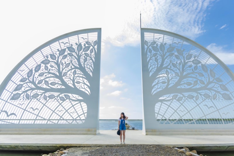 台南市將軍區青鯤鯓扇形鹽田,承載著超過300年的鹽業歷史,其獨特的扇形輪廓在全台相當罕見。而在2023年,市府特別在鹽田中央打造全新藝術裝置「生命之樹」,以純白拱門造型搭配中軸線步道,宛如劈開海水的視覺效果,自亮相以來立刻成為人氣打卡點。