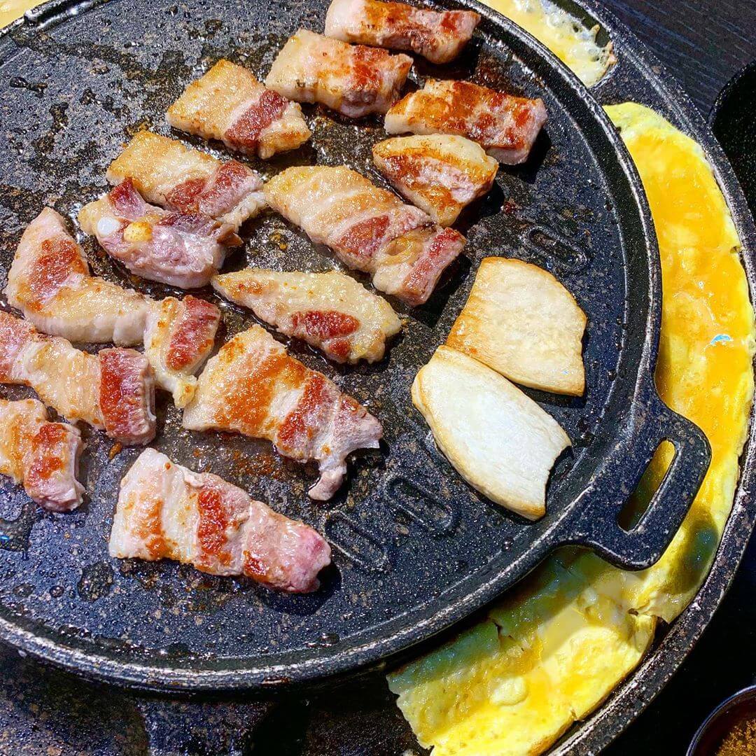 必須稱讚他們家的烘蛋,在點完餐後就會在鐵盤旁倒入蛋液和起司,本以為只是普通的烘蛋,沒想到吃下第一口驚為天人,吃起來就是剛烤好的布丁,綿密且有濃郁的蛋香,桌上的生菜吃完了可以續,搭配父的蒜片和泡菜夾肉,清爽不油膩,另外推薦海鮮煎餅,是份有厚度的煎餅,厚達1公分大口咬下滿滿的蝦子花枝,包準你吃的滿足。