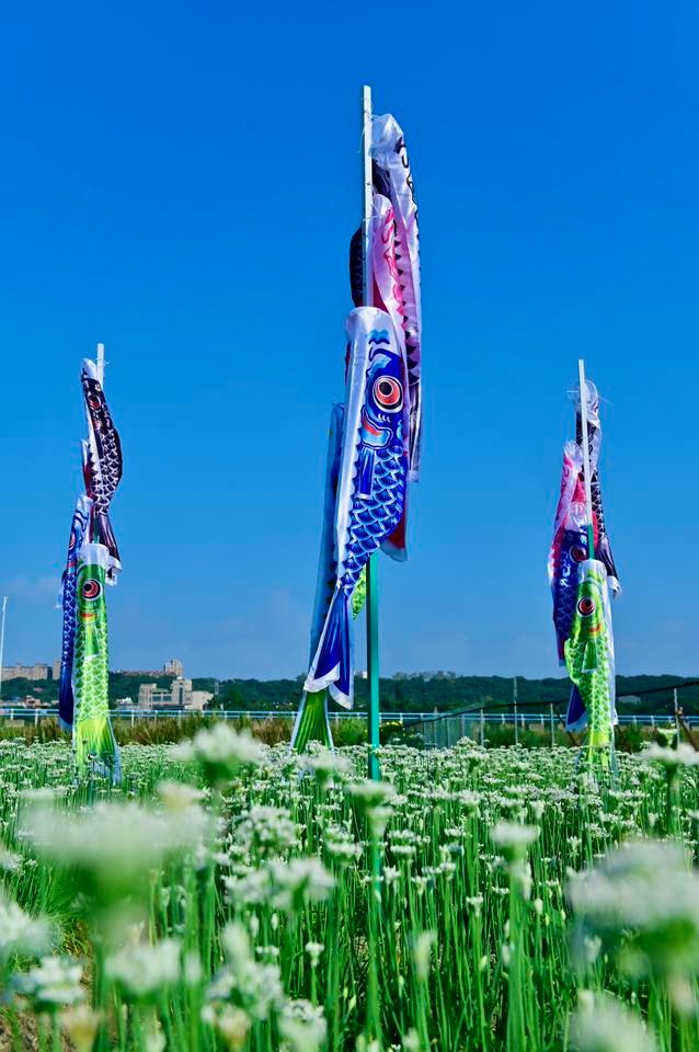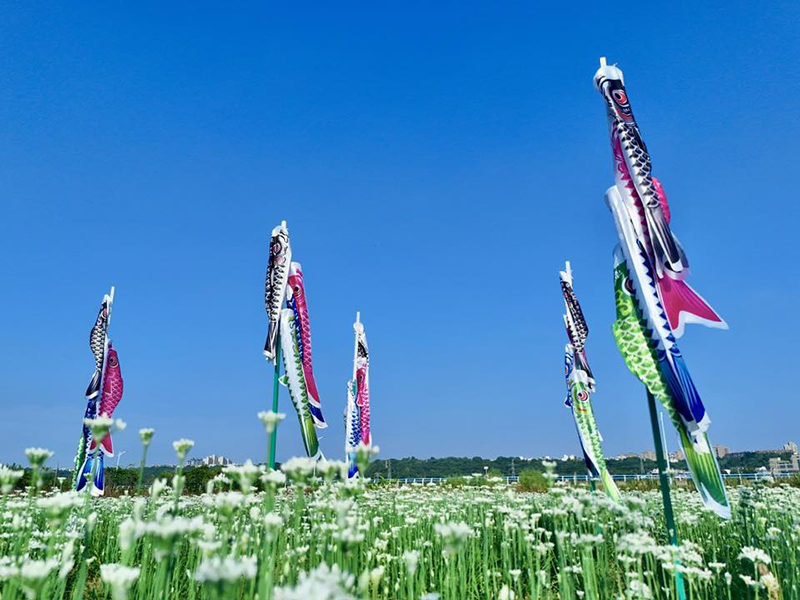 展區內最吸睛的,莫過於隨風飄揚的彩色鯉魚旗,以及「DAXI」(大溪)字樣的專屬造景。純白的韭菜花海與繽紛的旗幟交織,形成強烈的視覺對比。站在花田之間,不僅能拍下唯美氛圍感照片,也能留下專屬於大溪的旅遊記憶。