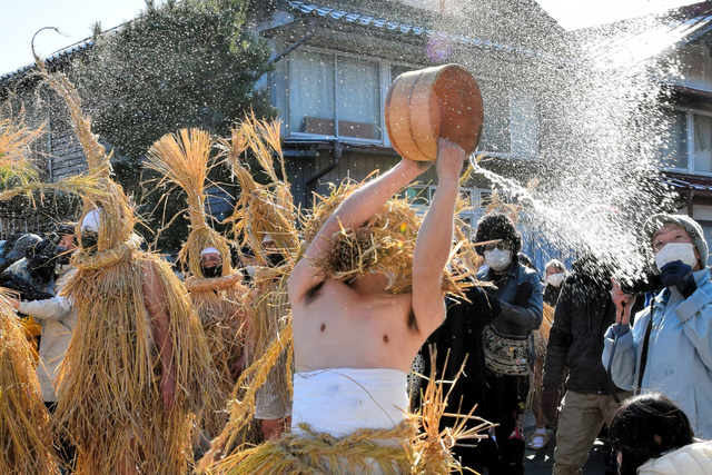 在祭典當天,人們會披上稻草製成的簑衣與頭盔,打扮成火神祝融的樣子,並挨家挨戶拜訪,為村民們獻上祝福。路途上,若是火神有看到路旁放著「水かぶり」的水桶,就會拿起來朝家戶潑灑,若是被潑水的家戶,一整年就可以免於祝融之災,被潑到的人們也可以保佑一年的平安!