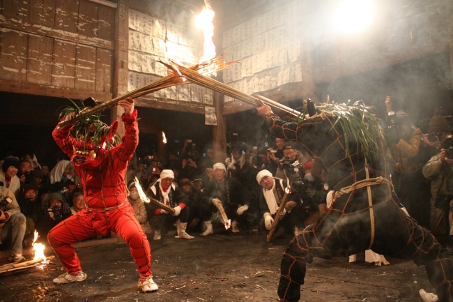 在祭典的最高潮,扮演成紅鬼與黑鬼的人們會揮舞著火把,一邊跳舞一邊撒著火粉,那魄力讓所有觀光客都為之懾服,若是在祭典上被鬼用火把拍打肩膀或是後背,即可獲得加持,是古日本流傳至今的獨特文化之一。