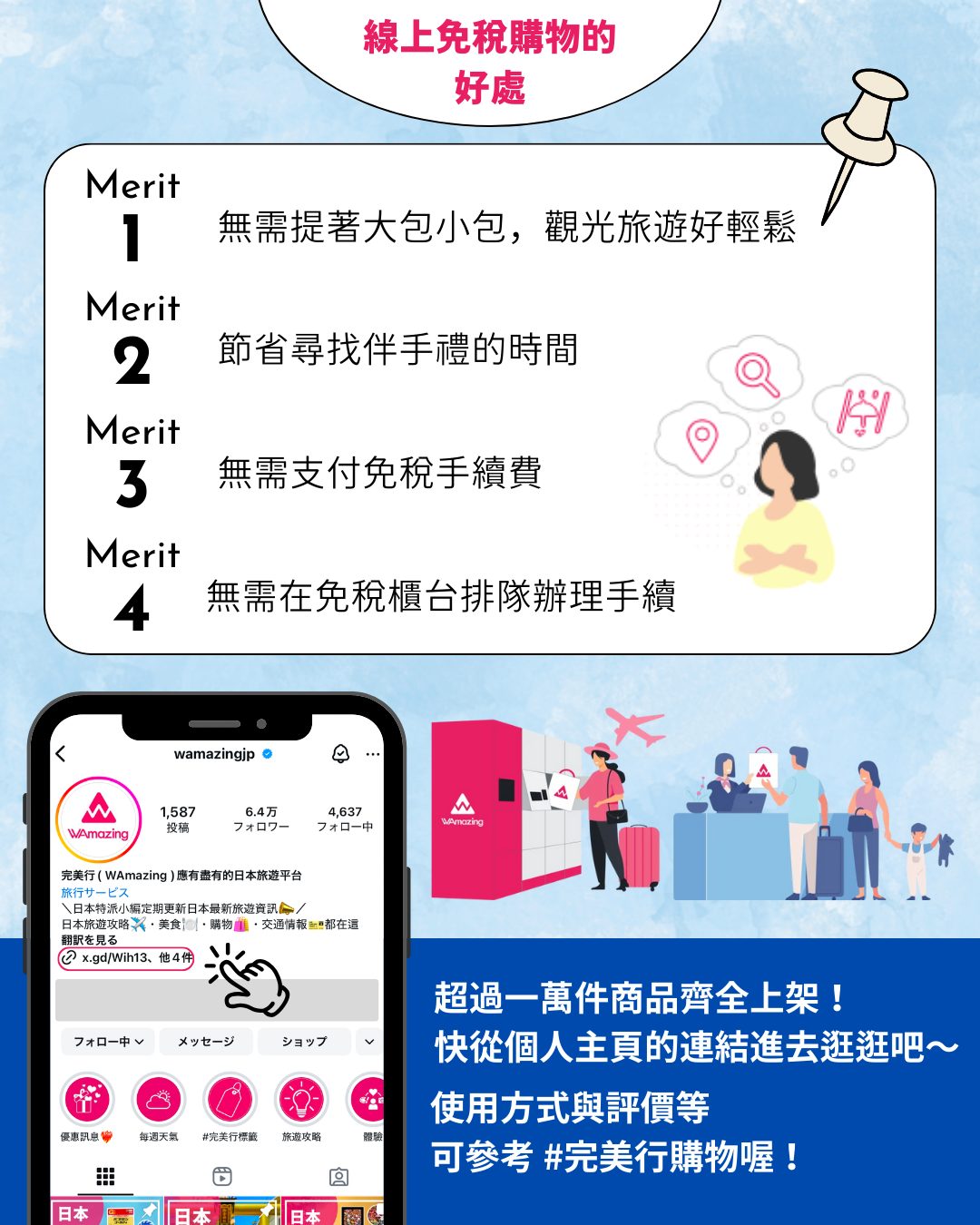 想去日本玩卻怕伴手禮買不完、行李提不動?專為訪日旅客設計的免稅線上購物服務「完美行購物」,現在更進化了!由 WAmazing 公司推出的這項服務,自 2025 年 6 月起陸續在東京、大阪、沖繩、福岡等地,與飯店合作提供人工取貨服務,取貨據點已經突破 100 處並持續擴大服務範圍中,讓民眾不必再跑遍藥妝店、不用大排長龍,也不用提著戰利品趴趴走!