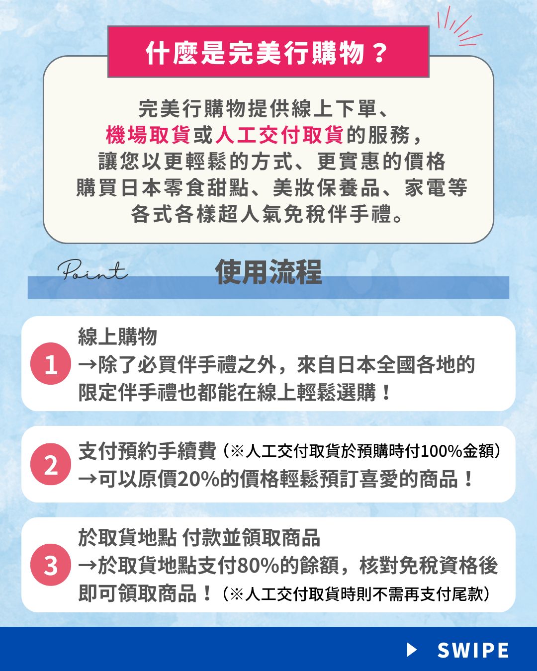 「完美行購物」是日本首創的線上免稅購物服務,讓旅客出發前就能把購物清單準備好。從人氣甜點、地方限定伴手禮,到化妝品、家電、酒類與藥品,數百種商品都能輕鬆預訂。透過線上完成訂購,不但免去到當地東奔西跑的辛苦,還能避免免稅櫃台大排長龍的等待,省下寶貴旅遊時間。