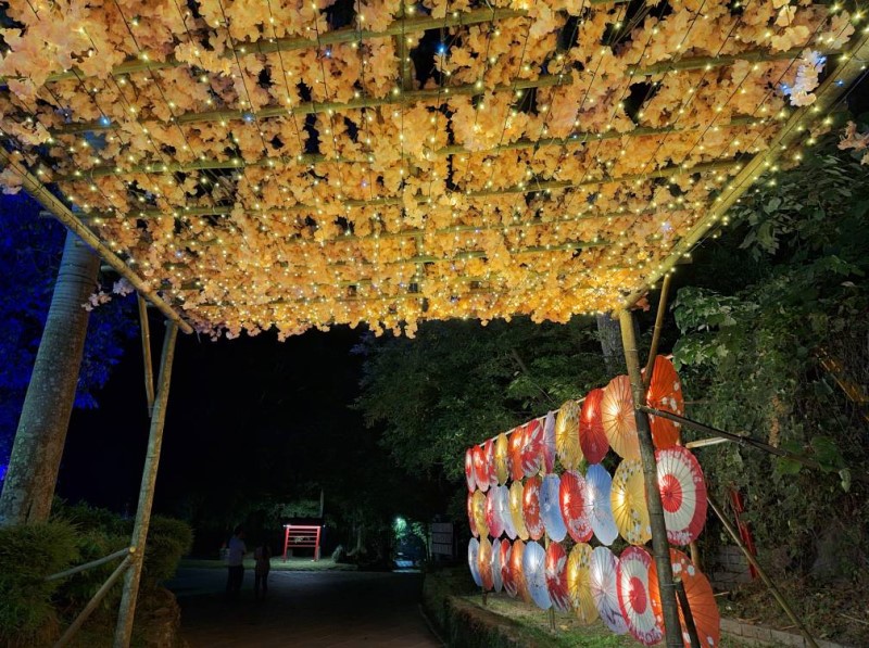 今年的光環境設計以「柔光 × 傳統 × 節慶」為核心,紙傘燈牆在夜色中織出古典之美,冰條燈則垂掛於樹影之間,如流光灑落。燈籠步道沿途延伸,映照出山霧中的朦朧美感,讓夜遊者彷彿走進一場光影詩篇。寶泉橋與嶺頂公園在燈光投影下化身「關子嶺光之門」,象徵溫泉文化與山城人文的融合,成為夜遊打卡的熱門亮點。