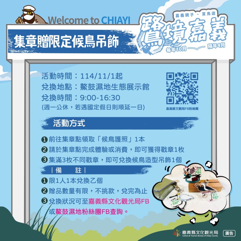 不只是賞鳥,今年還特別規劃「鷺境嘉義候鳥護照」集章活動。11月1日起,只要到指定地點完成任務或進行消費,就能集章換候鳥造型吊飾!家長們可以安排嘉義一日遊,在布袋搭海上巴士,在白水湖體驗當「蚵學家」,或是在鰲鼓濕地生態展示館學習新知識,從漁村文化到生態體驗一次玩透透。孩子能在玩樂中親近自然,家長也能稍微喘口氣,感受濕地的寧靜與季節的美好。