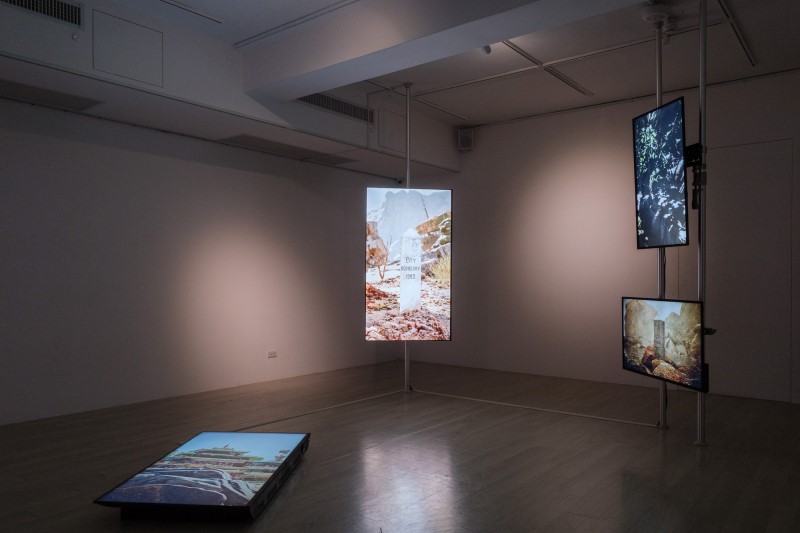 蔡宜婷的〈風與自然的樣子〉以染色葉片為媒介,展現自然的時間流轉;葉片隨風律動,彷彿在訴說生命的呼吸。王連晟的〈球型–太陽〉與〈地平線–海洋〉則運用程式即時生成影像,透過關鍵字搜尋轉化為動態視覺,揭示人類集體意識與AI之間的微妙關係。黃翰柏的〈移動的疆界〉以影像與聲音拼貼出「地方」的位移經驗,邀觀眾反思空間的定義與身體的流動性。李鍵的〈遺城〉則以3D動態影像重構香港維多利亞城界石,折射出歷史記憶、殖民疆界與身份的流動,於虛實之間展現臨界的詩意。